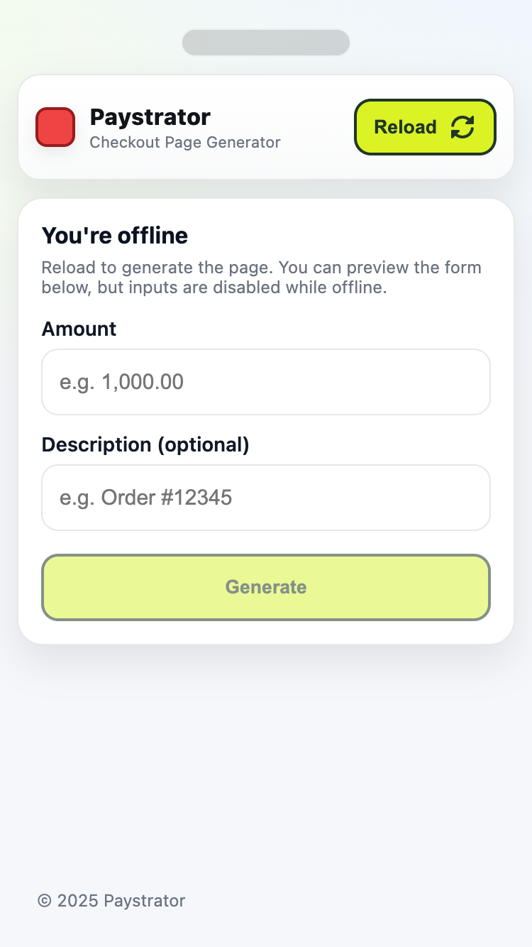 - When you navigate to the page while offline, a lightweight Offline screen is shown (read-only form preview + Reload button on the top-right).