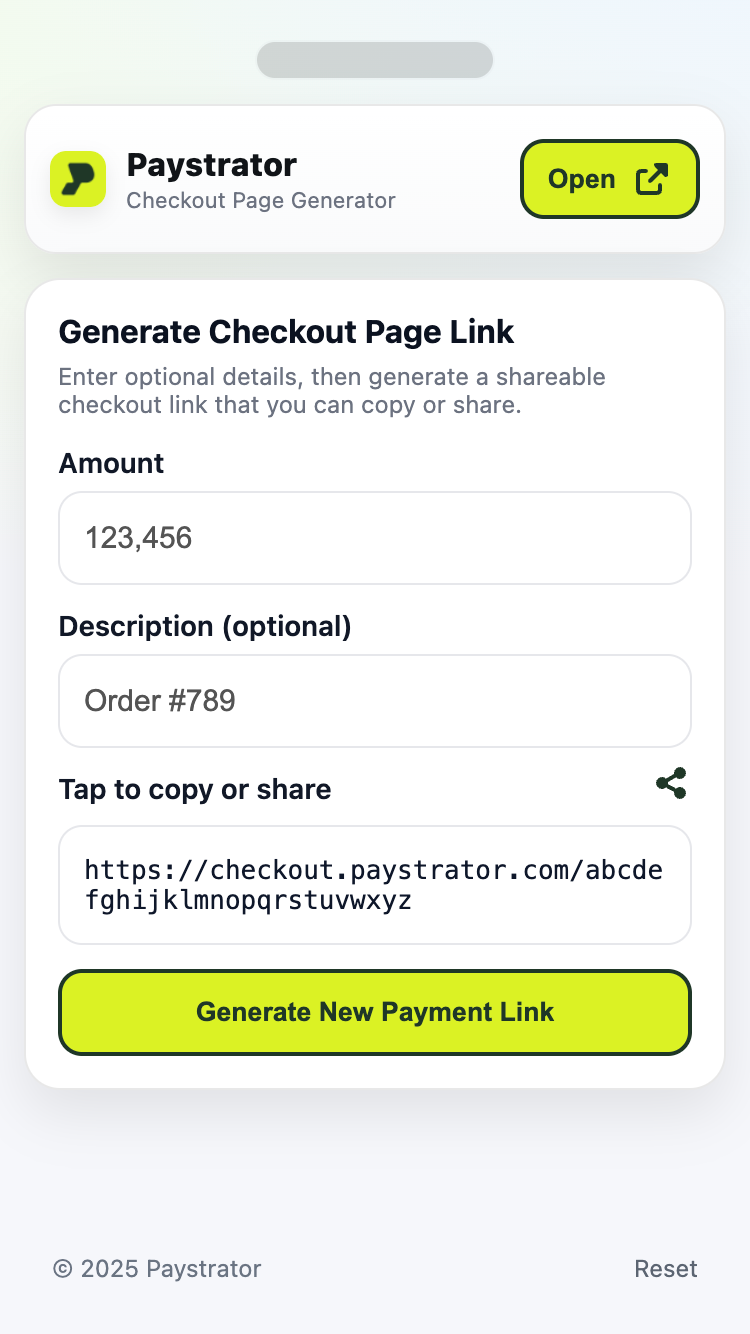 Generate a hosted Checkout Page Link without building any UI. Just open the page below and obtain a shareable checkoutUrl.